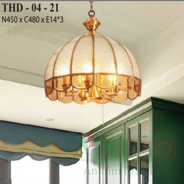Đèn thả đồng THD-04-21Chất liệu: Thân đèn bằng đồng và chao đèn bằng thuỷ tinhĐường kính đèn: 420mm.Bóng đèn: E14Kích thước: 450mmx480mmMàu sắc ánh sáng: